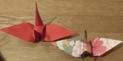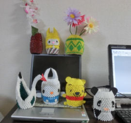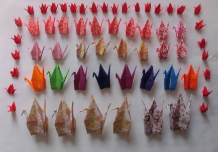 ![]() こんな、折り鶴を折ってみました。 一番小さいのは5センチ、つぎに、7.5センチ つぎに10センチ、大きいのは15センチ 千羽鶴に挑戦しよと思っています。 どのくらいの大きさが早く折れるか練習しています。 |