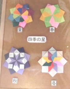 | 2018年08月20日(月曜日)曇りのち雨 最高気温26.0.度 3日間涼しい日が続き身体も休めたのではないかと思います。 昨日ふれあいセンターで行われたおりがみサロン、 四季の星です、春、夏。秋、冬。4個 写真の撮り方が悪くぼけてしまいました。 きょうのリハビリ散歩は休み |